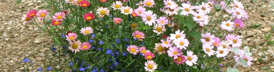Contenant les plantes annuelles aux couleurs vives et disposés selon les motifs d’un tapis, les « boites » rouges répondent à la contrainte physique du terrain rocheux sur toute la partie couverte de